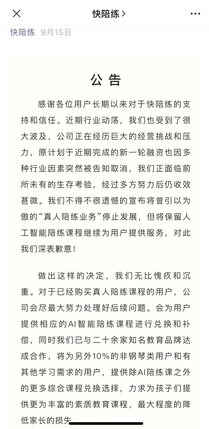 实际上,在宣布申请破产清算之前,快陪练曾在9月中旬发布公告称,对于已经购买真人陪练课程的用户,公司将会提供其他课程进行兑换和补偿,目前公司已与二十余家知名教育品牌达成合作,将提供除AI陪练课之外的更多综合课程兑换选择,力求最大程度的降低家长的损失。