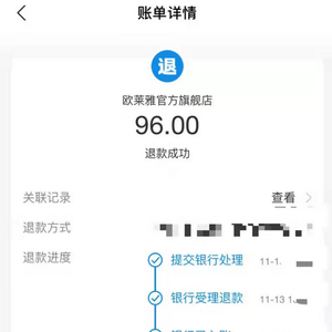 “欧莱雅官方旗舰店”向部分消费者的96元退款账单截图/受访者供图