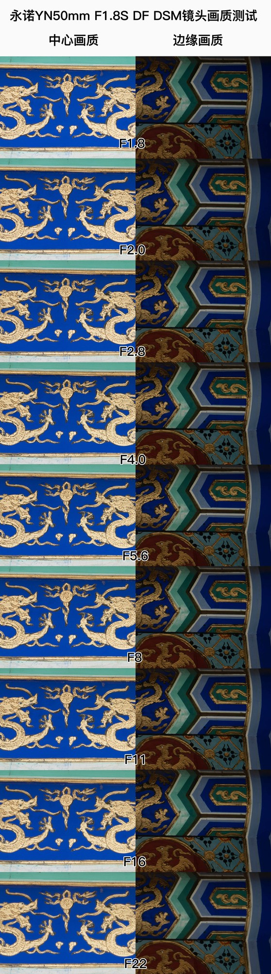 缩减一档光圈之后,从F2开始一直F11光圈下,YN50mm F1.8S DF DSM镜头的锐度表现都处于最佳状态,不论是中心还是边缘,镜头的画质都非常优秀,也就是这个光圈范围内,大家可以随意使用,不必担心画质问题。