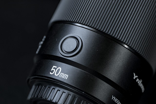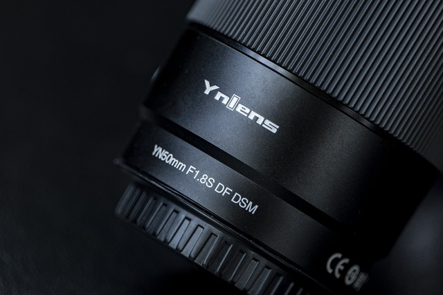 YN50mm F1.8S DF DSM镜头上印着硕大的50mm字样,同时还有永诺镜头的英文字样以及产品的完整型号。