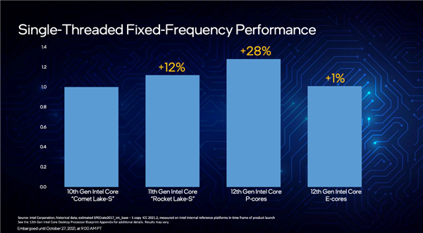 Intel官方称,同等频率下,小核性能比10代酷睿还要高1%,比大核只弱了27%,其在桌面上的主要用途是提升多核性能。