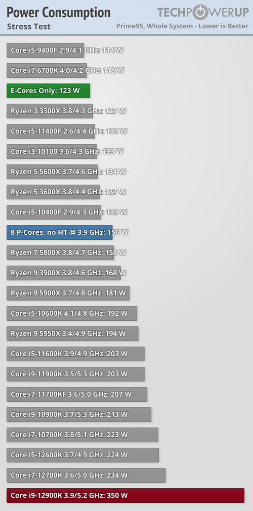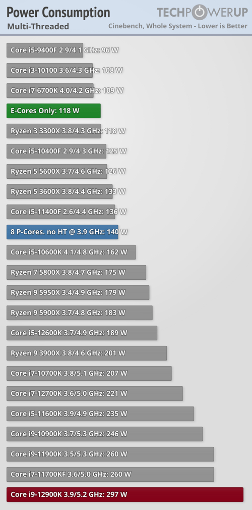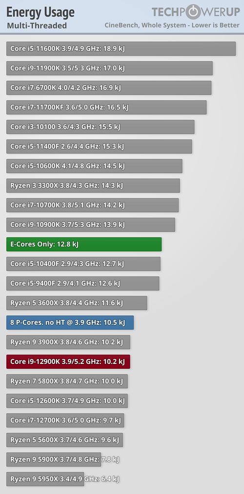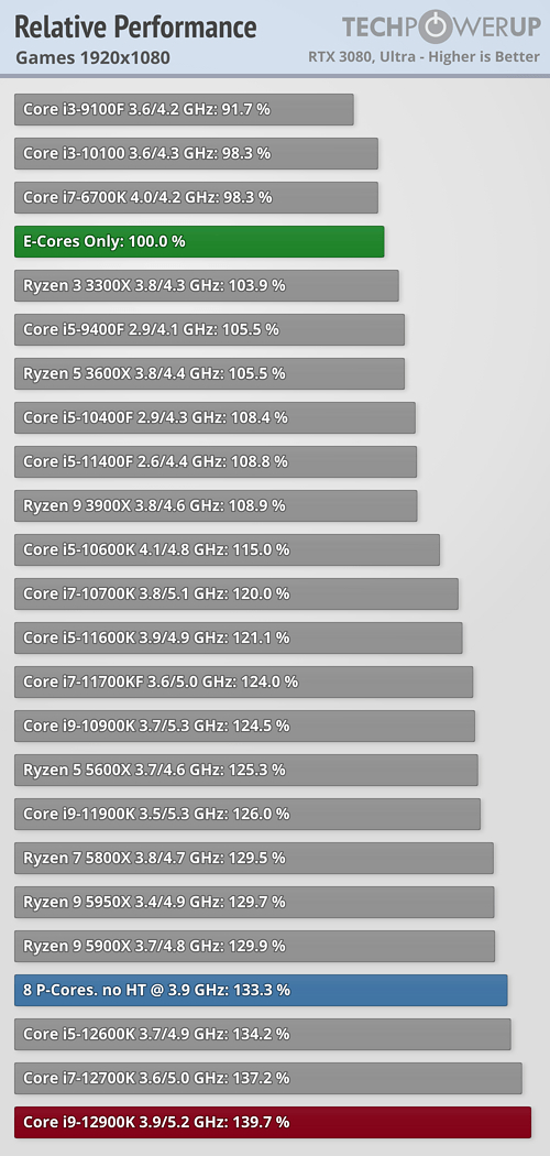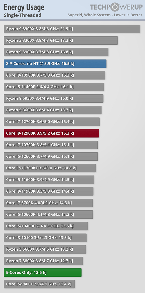 TechPowerrUp近日进行了一项特别的测试,找来一颗旗舰i9-12900K,除了正常跑分,还分别关闭所有小核、所有大核(和超线程),而且都设定在3.9GHz频率下(大核基准频率),看看性能、功耗到底差多少。