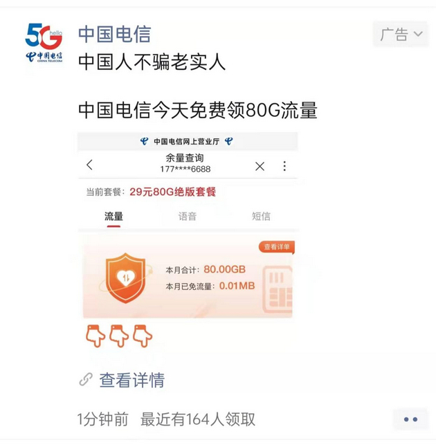 以朋友圈推送的中国电信的广告为例,广告封面的文案为“中国人不骗老实人,中国电信今天免费领80G流量”,配图为29元80G绝版套餐。