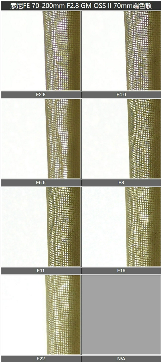 通过测试样张的100%截图后,我们可以看到索尼FE 70-200mm F2.8 GM OSS II在控制色散方面的表现非常出色,70mm端和200mm端在各档光圈下均没有明显的色散和紫边情况发生。可以说,这枚镜头的光学设计非常好。