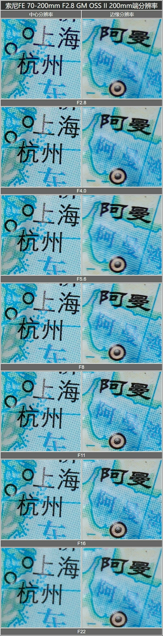看完70mm端的分辨率后,我们再来看看200mm端的分辨率,测试方法同70mm端一样。