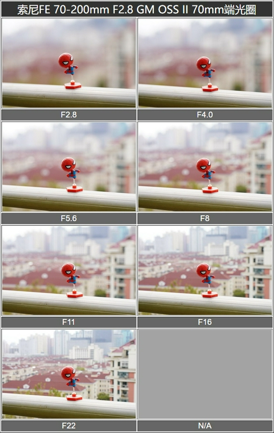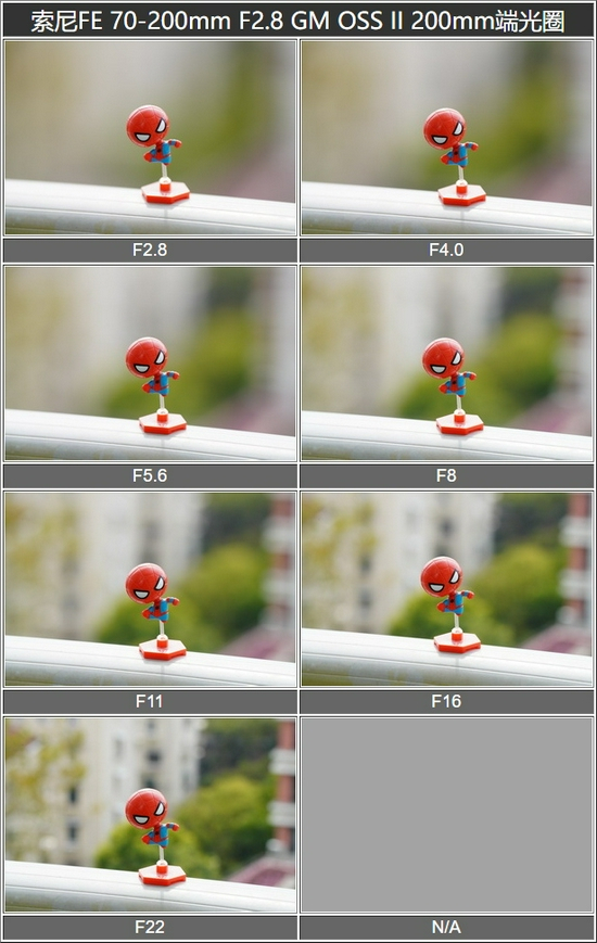 从测试图表中可以清楚看到不同光圈下背景虚化效果的不同,而且由于FE 70-200mm F2.8 GM OSS II本身就有长焦虚化的优势,再配合上11枚叶片的圆形光圈,因此在F22的小光圈下仍然有非常不错的背景散焦效果。
