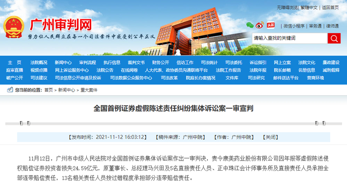 11月12日,A股集体诉讼第一案康美药业案一审宣判。根据该案民事判决书,康美药业原董事长、总经理马兴田及5名直接责任人员等需要承担全部连带赔偿责任,13名相关责任人员按过错程度分别承担不同比例的部分连带赔偿责任。