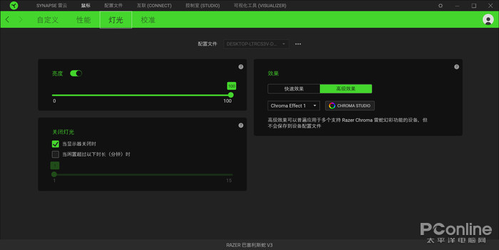 巴塞利斯蛇V3在即插即用的状态下是默认是光谱循环灯效,安装雷蛇自家的RazerCentral后玩法就多起来了,想要省事的玩家可以在RazerCentral的鼠标-灯光菜单下直接设置鼠标的灯光控制效果,一键设置即可快速享受到雷蛇氛围灯带来的良好观感。