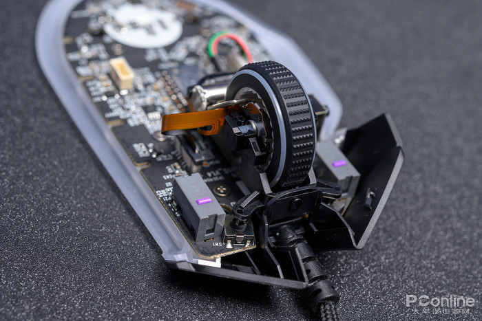 位于鼠标底部的灯带藏得很深,需要卸下主板翻到背面才能看到真容。