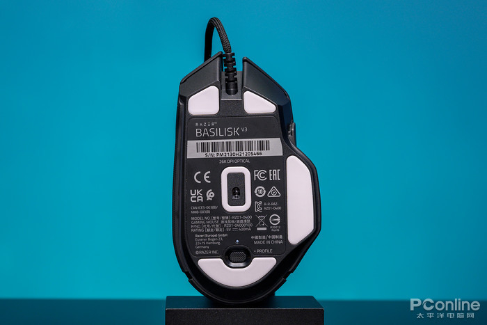 鼠标底部为白色脚垫,根据雷蛇的官方说法,这是100%PTFE脚垫,能在多种材质的表面上流畅滑动而不用担心会出现粘连现象。