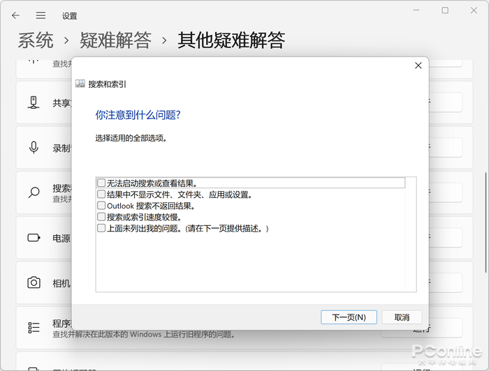运行“搜索和索引”的修复功能,系统会弹出一个窗口,自动检查问题所在。之后,该窗口会呈现你可能遇到的系统搜索相关的问题,例如无法启动搜索或查看结果等等,按照实际情况选择即可。