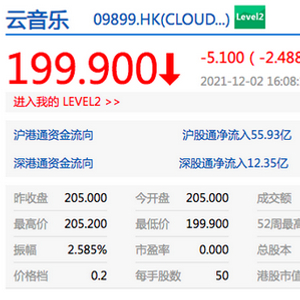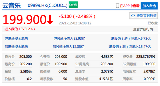 新浪科技讯 12月2日下午消息,网易云音乐今日在港上市,上市首日收盘报199.9港元每股,较发行价205港元下跌2.49%,成交额约4.58亿港元,市值为415.3亿港元。