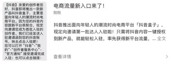 有不少的创作者告诉Tech星球,他们收到了来自抖音官方邀请的“抖音盒子”链接和短信,根据短信内容可知,抖音即将上线一款新产品“抖音盒子”,定位则是面向年轻人的潮流时尚电商平台,抖音盒子将是电商流量的新入口。而这些创作者将成为抖音盒子的内容推手,着力于打造兴趣电商。