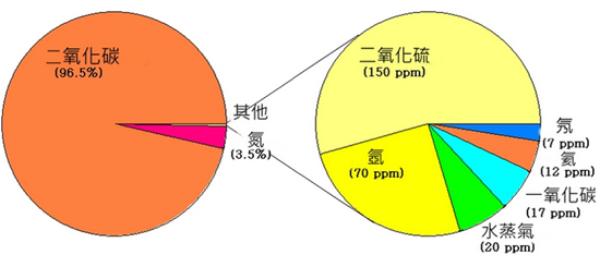 尽管金星与地球有很多相似之处,但两者还是存在着巨大的差别。金星基本没有磁场,众所周知,如果一个行星上没有磁场,那么它的大气层也很难存在,但金星却是一个例外,金星表面有一层厚厚的大气层,更恐怖的是大气层的主要成分是二氧化碳和二氧化硫。