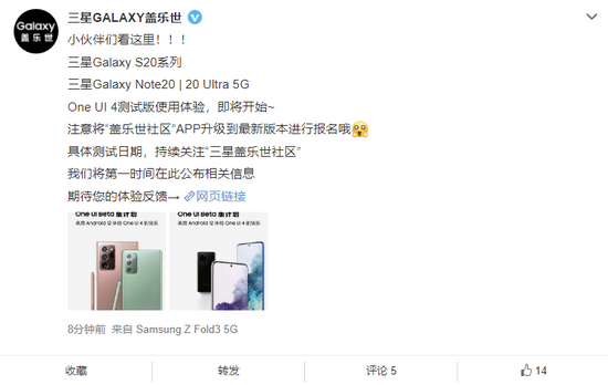 三星 Galaxy Z Fold3 5G & Galaxy S20 系列 & Galaxy Note20 系列用户今日开启了 One UI 4 内测体验,目前已经有 S20 系列用户反馈收到了更新推送(更新: Z Fold3 延迟至明天,Note 20 系列正常)。