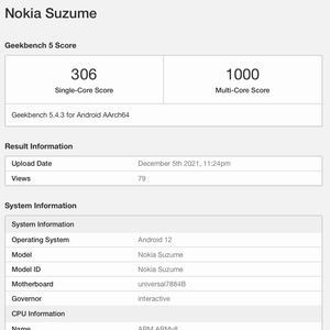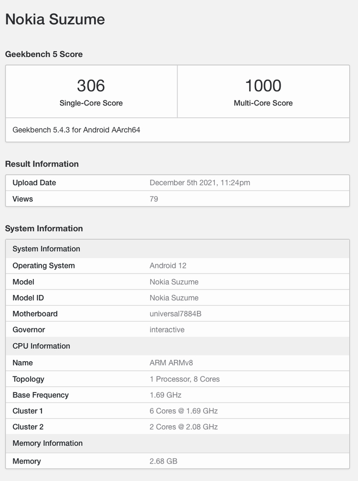 据 Nokiamob 消息,诺基亚一款型号为 Suzume 的新机出现在了 Geekbench 跑分平台上。