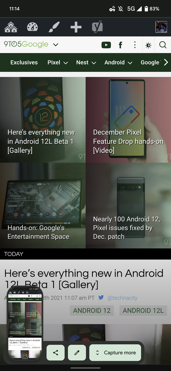 当安卓 12 在今年 10 月底推出时,左下角屏幕截图预览中的“捕获更多”按钮不会出现在 Chrome 浏览器中。这是由于谷歌浏览器和其他 WebView 实例不是“基于标准视图的用户界面”。
