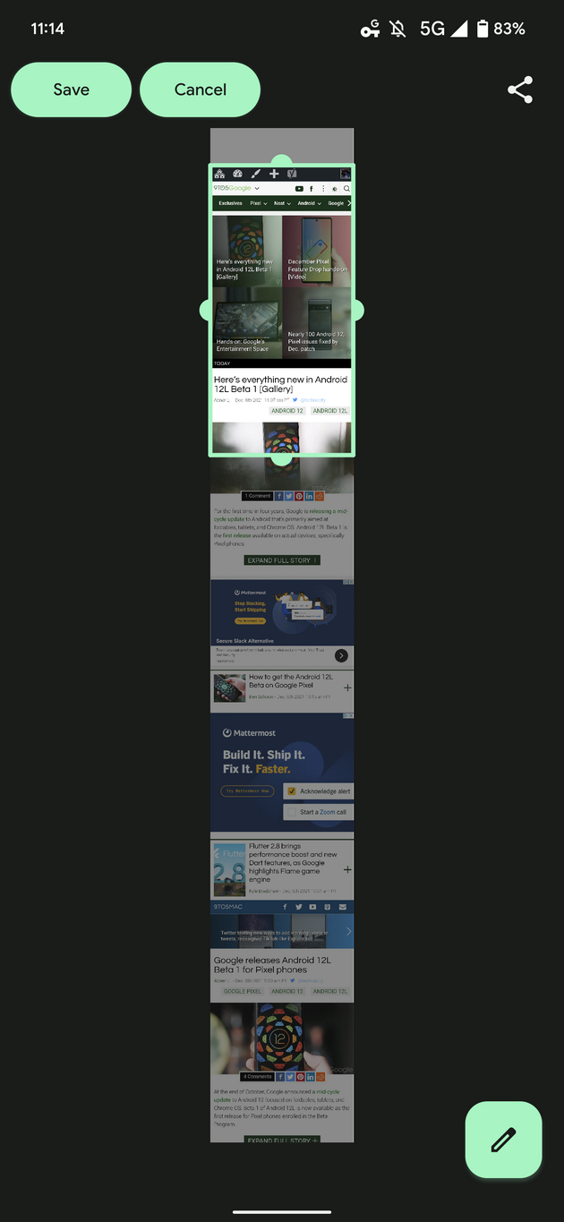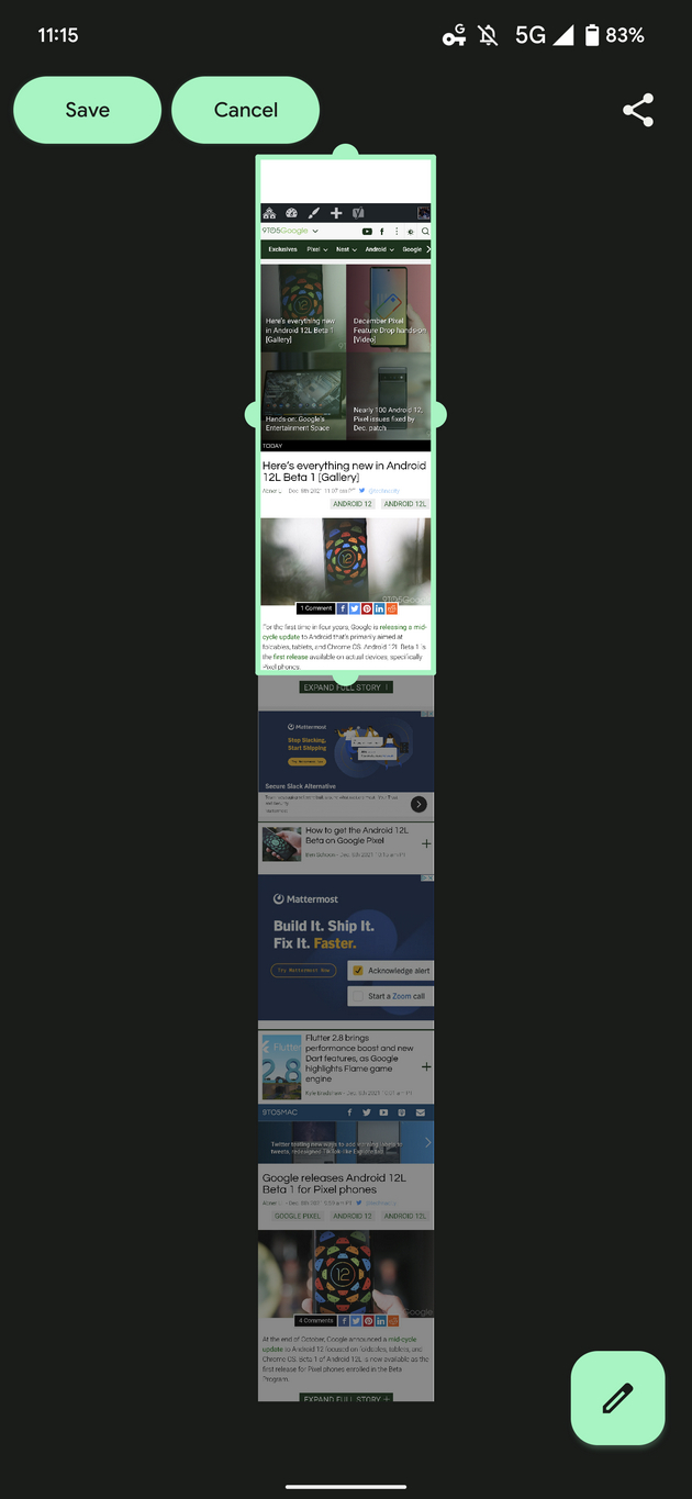 也就是说,谷歌一直在努力使滚动屏幕截图在全系统范围内可用,现在安卓 12 上的 Chrome 浏览器获得了滚动屏幕截图支持,无需任何额外的用户操作。这一变化在今天广泛推出(最新版本的 Chrome 96 已广泛推出)。媒体发现,已出现在运行 11 月安全补丁的 Pixel 6 Pro,以及运行 12 月补丁的 Android 12 和 Android 12L 的谷歌设备上。