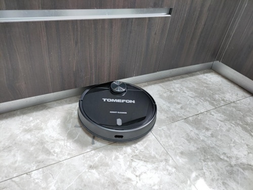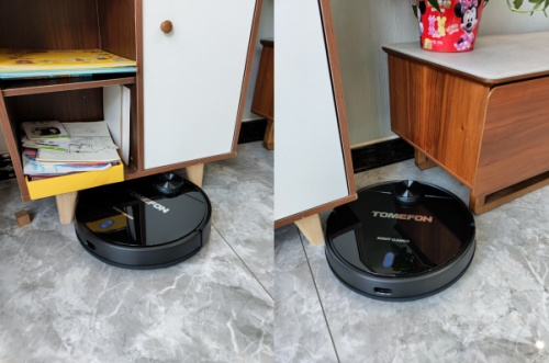 而小编评测户型的家居摆设较多,除了床、沙发、橱柜、桌椅以外,地面还有玩具、花盆等物件,置身于如此复杂的环境中,斐纳TOMEFON扫地机器人却能与之和平共处,灵敏度还是非常高的。在清扫地面时,它能轻松避开桌椅脚、并且将周边打扫的干干净净。