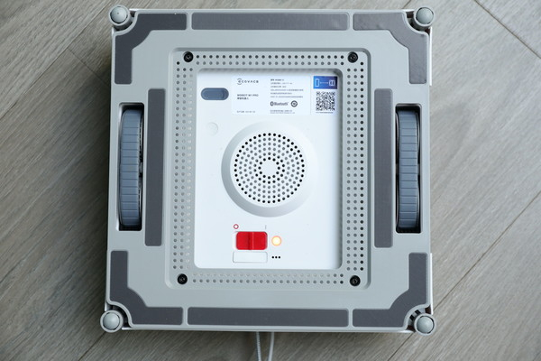 科沃斯窗宝W1 PRO的底部就比正面要复杂一些了,底部正中为提供真空吸力的风机,可以提供2800Pa的超大真空吸力帮助窗宝固定在窗户上,红色拨键为电源开关,同时底部还设置了吸力感应器。值得注意的是,这次的驱动轮被安排在了偏两侧的地方,所以清洁布粘扣也因此作出了重新设计,这样的设计也是为了窗宝在清洁的时候拥有更高的稳定性。