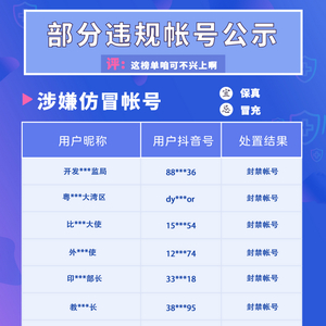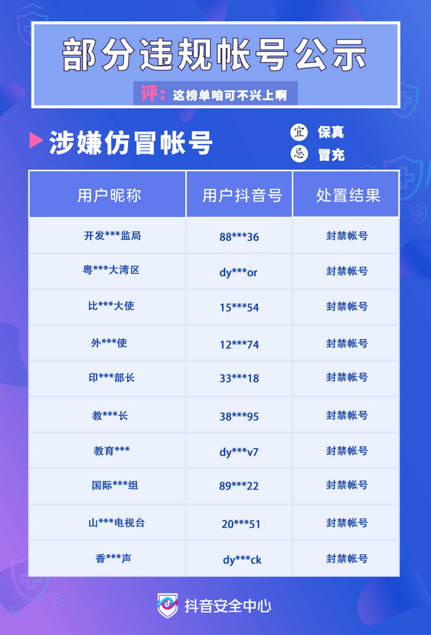 抖音安全中心12月17日公布年度部分头部违规账号名单。