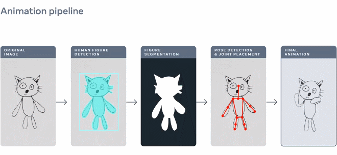 近日,Meta 宣布首创了一种 AI 系统,该系统可以在没有任何人工指导的情况下,高成功率的自动为儿童手绘人物和类人角色(即有两条胳膊、两条腿、一个头等的角色)制作动画,几分钟就可以实现从一张静态图到动画的转变。