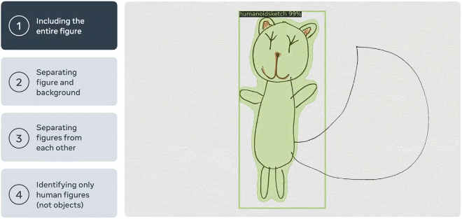 第一步是将绘画中的人物与背景以及绘画中的其他类型的角色区分开来。使用现有的目标检测方法在儿童绘画上识别效果较好,但分割掩码不够准确,无法用于动画。为了解决这个问题,Meta 改为使用从目标检测器获得的边界框(bounding boxes),并应用一系列形态学操作和图像处理步骤来获得掩码。