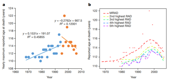 2016年,《自然》杂志刊登了一篇标题为Evidence for a limit to human lifespan的论文。来自美国阿尔伯特·爱因斯坦医学院的科学家分析了过去约半个世纪间,法国、日本、美国和英国的长寿人群的死亡年龄变化情况后发现,这一数字在上世纪末趋于稳定,这说明人类正在迫近这个寿命上限。