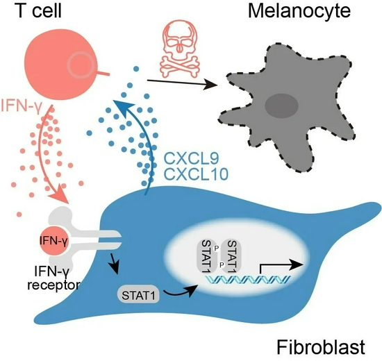 这些实验说明,不同部位成纤维细胞对γ干扰素的响应能力不仅决定其招募CD8+ T细胞的能力,也决定了白癜风的发病位置偏好。
