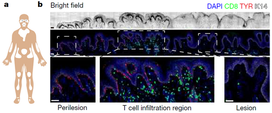 科学家已经了解到的是,皮肤白斑是由CD8+ T细胞异常攻击自体黑色素细胞产生的,而γ干扰素信号对于这个过程至关重要。但究竟是哪些细胞响应了γ干扰素的功能,此前的研究并未给出答案。对于占据全球人口0.5%~2%的白癜风患者来说,揭示疾病的调节机制就显得尤为迫切。