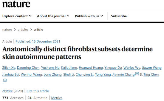 这篇标题为“Anatomically distinct fibroblast subsets determine skin autoimmune patterns”的论文12月16日发表于《自然》杂志。北京生命科学研究所陈婷研究员和北京医院常建民教授为该论文的共同通讯作者。北京生命科学研究所的徐子健和陈道明为共同第一作者。
