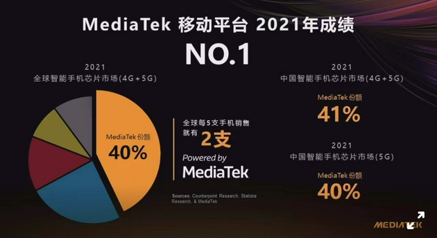 除了全新的旗舰芯片,联发科技在2021年取得的成绩同样引人关注。目前,联发科技已经连续6个季度成为智能手机芯片出货量第一供应商,此外联发科技2021年全球4G+5G手机芯片出货量份额达到了40%,成为全球第一。而且联发科在中国4G+5G市场份额也达到了41%,单5G市场份额高达40%,同样稳居国内市场第一。