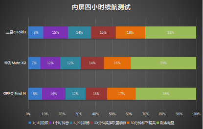 OPPO Find N刚发布就被不少网友吐槽4500mAh电池小,要知道华为Mate X2也是4500mAh,三星Z Fold3是4400mAh,加上Find N内外屏屏幕都更小,续航可能会有不错的表现。但该机内屏又是120Hz高刷,可能会影响续航体验,我们也针对内屏拿三款手机进行了对比。在内屏四个小时续航测试中,OPPO Find N的最终是剩余电量为37%,和其他两台折叠屏手机成绩相差不大,续航成绩甚至要比三星Galaxy Z Fold3还要好上一些。而且OPPO Find N在闪充方面支持33W超级闪充和15W无线充电,有线充电场景下能够做到半小时充进55%的电量,这样的表现基本够用了。华为Mate X2充电最强达到了66W,三星则是25W。