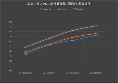 虽说折叠屏手机胜在屏幕形态,不过硬件性能始终是加分项,对于大部分人来说,硬件的性能好坏基本决定了一款手机的上限和下限。其中华为Mate X2搭载麒麟9000处理器,而OPPO Find N和三星Z Fold3则采用了年度旗舰芯片高通骁龙888,其性能毋庸置疑。从游戏帧率测试来看,该机的游戏表现确实很稳,《王者荣耀》、《和平精英》等主流手游也能保持满帧运行,即便是对性能要求苛刻的《原神》也能高帧率运行。在大家关心的发热方面,三款手机的表现如下,华为OPPO表现接近,三星稍微高一点。
