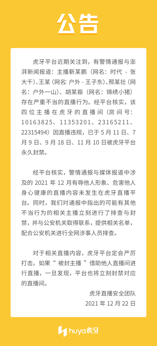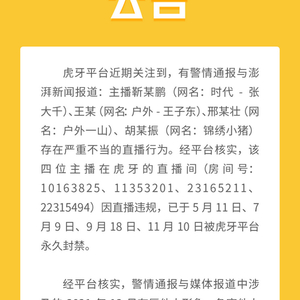 虎牙平台近期关注到,有警情通报与澎湃新闻报道:主播靳某鹏(网名:时代-张大千)、王某(网名:户外-王子东)邢某壮(网名:户外一山)、胡某振(网名:锦绣小猪)存在严重不当的直播行为。经平台核实,该四位主播在虎牙的直播间(房间号:10163825 1135320123165211、22315494)因直播违规,已于5月11日、7月9日、9月18日、11月10日被虎牙平台永久封禁。