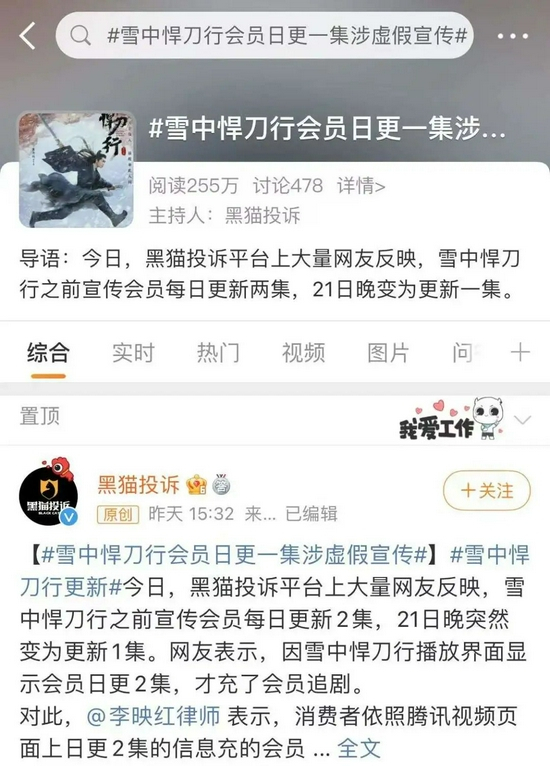 近日, 《雪中悍刀行》之前宣传会员每日更新两集,21日晚变为更新一集,收到了大量网友投诉,并在微博上引起了相关讨论。