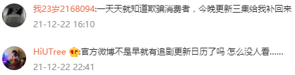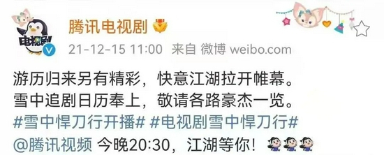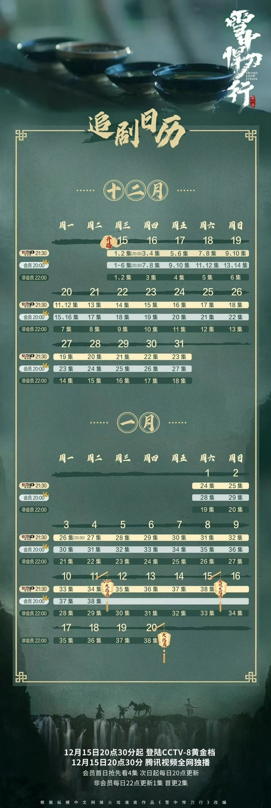 腾讯视频表示,为同步央视更新速度,自12月21日起,腾讯会员更新集数由每日20点更新2集转为1集,腾讯电视剧官方微博号也提前发过《雪中悍刀行》追剧日历明示告知。