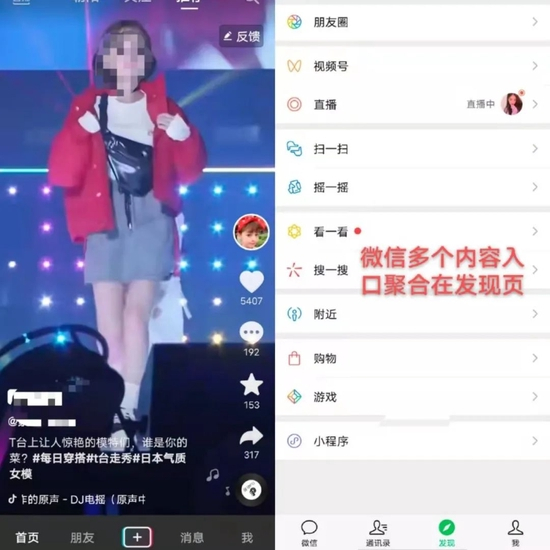 抖音的首页则与微信的发现页对应,不同的是微信将不同的内容做成了入口,使发现页成为了内容的聚合入口。