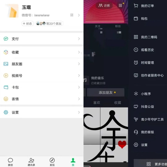 最后就是抖音的个人中心与微信个人中心,两者除了显示用户的基本信息外,也都加入了支付入口。