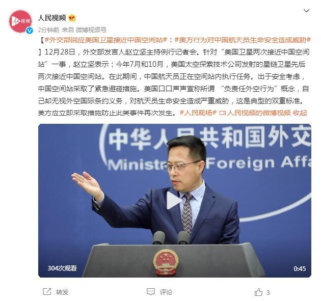 原标题:外交部回应美国卫星接近中国空间站:美方行为对中国航天员生命安全造成威胁