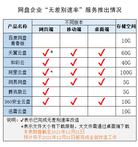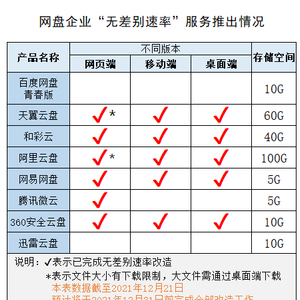 IT之家12月30日消息,工信部此前要求百度网盘、腾讯微云、天翼云盘、和彩云、阿里云盘、迅雷云盘、360安全云盘和网易网盘等在2021年推出“无差别速率”产品,据人民邮电报测试,已有多家网盘完成改造。