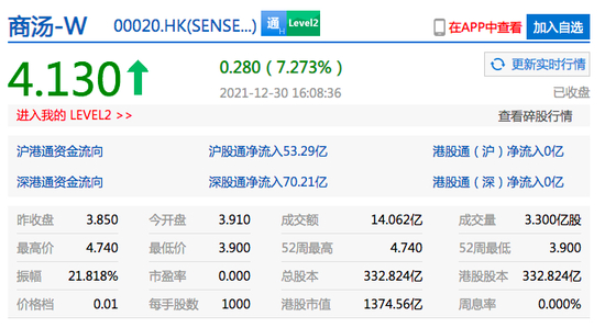 新浪科技讯 北京时间12月30日上午消息,AI独角兽商汤科技今日正式登陆港交所,上市首日收盘报4.13港元每股,较发行价3.85港元上涨7.3%,成交额约14亿港元,市值为1374.56亿港元。