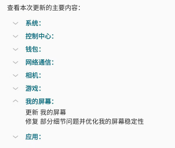本次更新优化了手机的触摸体验、指纹体验、充电性能、防屏闪算法,优化了屏幕亮度调节算法,优化了三方协议充电兼容性。此外,还优化了 CPU / GPU 调度策略,平衡性能和功耗;修复部分场景耗电异常问题;修复部分细节问题并优化系统稳定性。