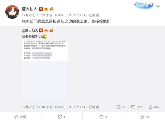 无独有偶。多位电商达人陆续在网络晒出自己收到的补税通知。另一名电商达人调侃“准备卖海鲜给京东补税”。其账单显示,2020年需补税金额221,864.09元,2021年需补税金额58,393.48元,需在12月29日之前补缴完。