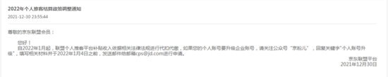 通知还强调,“如果您的个人账号要升级企业账号,可以关注公众号‘京粉儿’,回复关键字‘个人账号升级’,填写相关材料并于 2022年1月4日之前,发送邮件给邮箱cps@jd.com进行申请。”