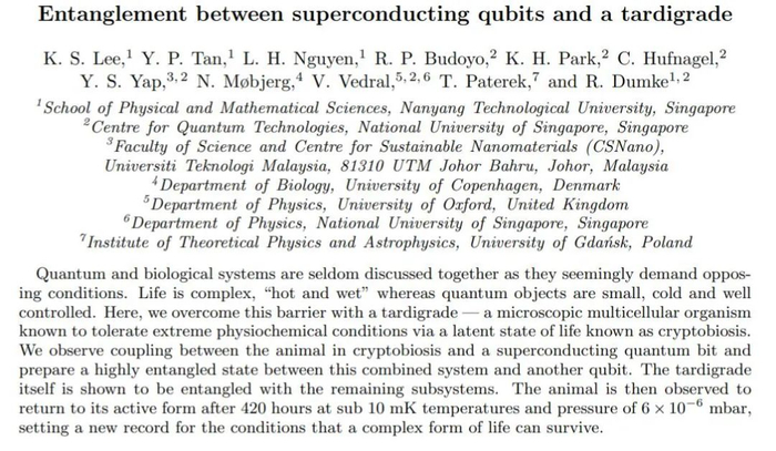 然后研究者在许多不同的条件下测试系统以确定量子态,他们发现由量子比特和缓步动物组成的系统占据的能量状态比任何一个单独占据的都低。研究人员得出结论:二者已经纠缠在一起。