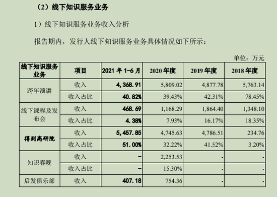 其中,2018年度,跨年演讲收入为5763.14万元,收入占比为78.45%;2019年度,跨年演讲收入为4877.78万元,收入占比为42.31%;2020年度,跨年演讲收入为5809.02万元,收入占比为39.43%;2021年1-6月,跨年演讲收入为4368.91万元,收入占比为40.82%。