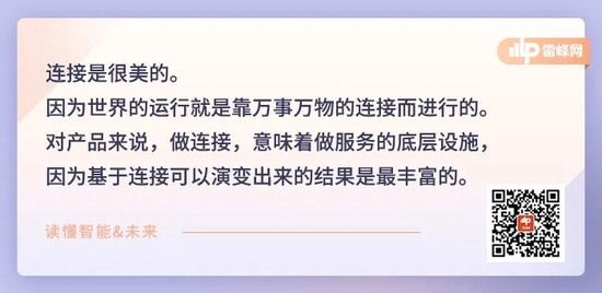 连接是很美的。因为世界的运行就是靠万事万物的连接而进行的。对产品来说,做连接,意味着做服务的底层设施,因为基于连接可以演变出来的结果是最丰富的。