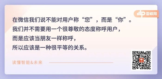 在微信我们说不能对用户称“您”,而是“你”。我们并不需要用一个很尊敬的态度称呼用户,而是应该当朋友一样称呼,所以应该是一种很平等的关系;