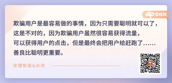 欺骗用户是最容易做的事情,因为只需要聪明就可以了,这是不对的,因为欺骗用户虽然很容易获得流量,可以获得用户的点击,但是最终会把用户给赶跑了……善良比聪明更重要;